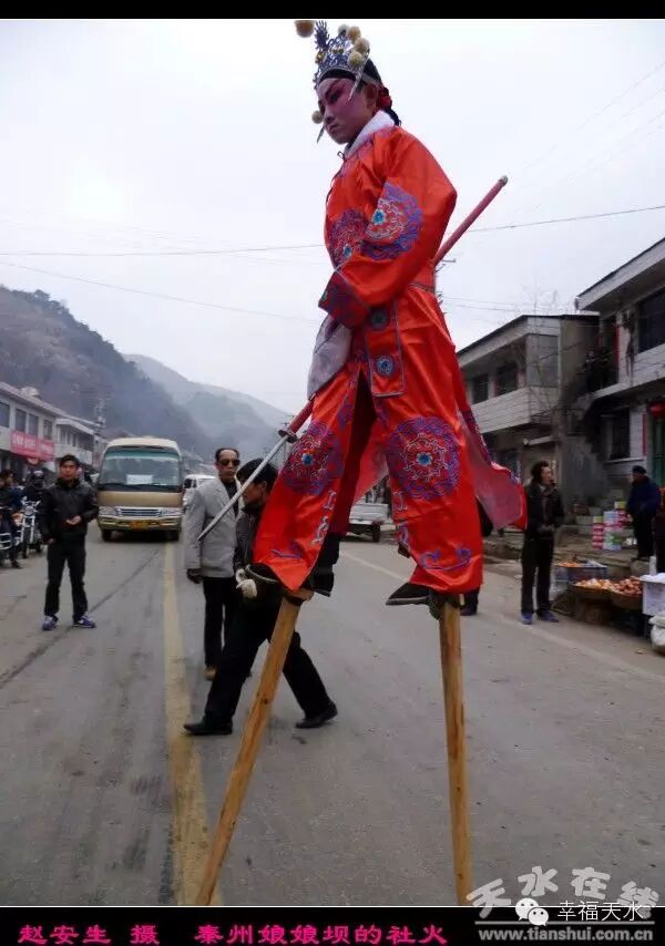 天水的白社火還有一種形式,那就是馬社火。馬社火因表演者騎在騾馬之上而得名。馬社火常在農村表演,一般按照某一神話傳說或歷史故事,選取幾個角色,騎在牲畜之上,在村與村之間表演,因為當地不少人認為這種方式能夠驅鬼避邪,迎春送喜。